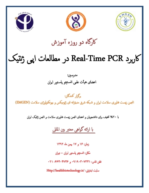 2- کارگاه دو روزه آموزش کاربرد Real Time PCR در مطالعات اپی ژنتیک · سرفصلها: 1- آشنایی با اصول اولیه Real time PCR 2- اپی ژنتیک و روش های ارزیابی متیلاسیون 3- اصول طراحی پرایمر در متیلاسیون 4- ارزیابی متیلاسیون با روشهای هضم آنزیمی و بی سولفیت و HRM 5- اجرای روش هضم آنزیمی 6- اجرای روش Real time PCR 7- ارزیابی نمونه های هضم شده به روش Real time PCR · زمان: 16 و 17 بهمن ماه 1392 · مکان: انستیتو پاستور ایران · هزینه شرکت در دوره برای هر نفر: دانشجویی 250.000 هزار تومان و آزاد 300.000 هزار تومان · با ارائه گواهی معتبر بین المللی