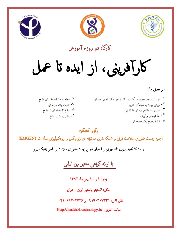 · زمان: 9 و 10 بهمن ماه 1392 · مکان: انستیتو پاستور ایران · هزینه شرکت در دوره برای هر نفر: دانشجویی 140.000 هزار تومان و آزاد 160.000 هزار تومان · با ارائه گواهی معتبر بین المللی
